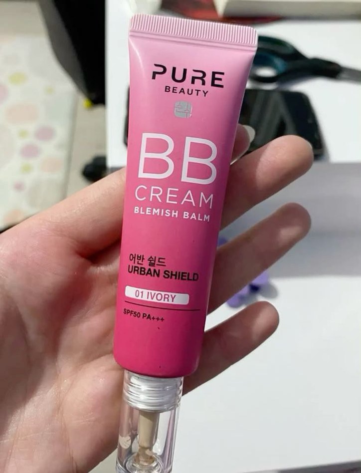 Pastel pembe tüpte Pure Beauty Urban Shield BB Krem 01 Ivory, SPF50 PA++ koruması ve kapatıcılık sağlar.