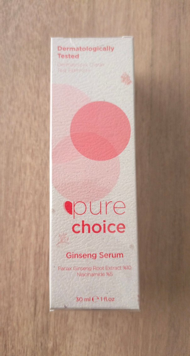 Pure Choice Ginseng Serum, %5 niacinamide ve %10 Panax ginseng kökü özü içerir. Dermatolojik olarak test edilmiştir. hiç kullanılmadı sıfır orjinal ürün skt 05/26