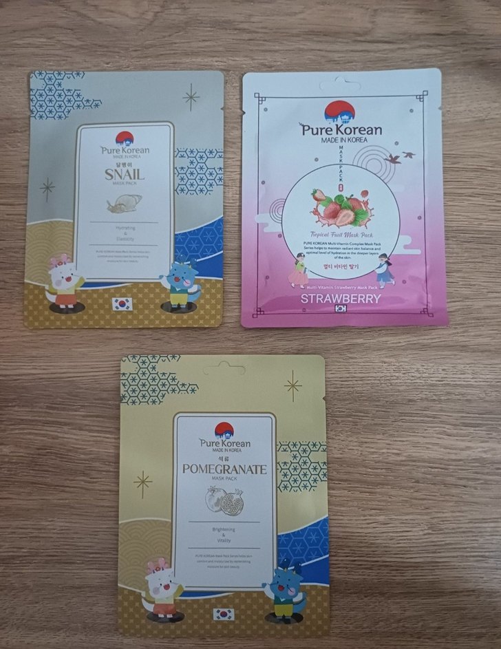 Pure Korean markalı salyangoz, çilek ve nar özlü yüz maskeleri, cilt bakım ve aydınlatma için.