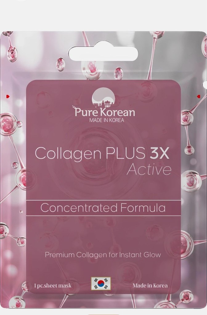 Pure Korean Kollajen PLUS 3X Active maske, Kore'den yoğun formüllü premium kollajen ile anında parlaklık sağlar.