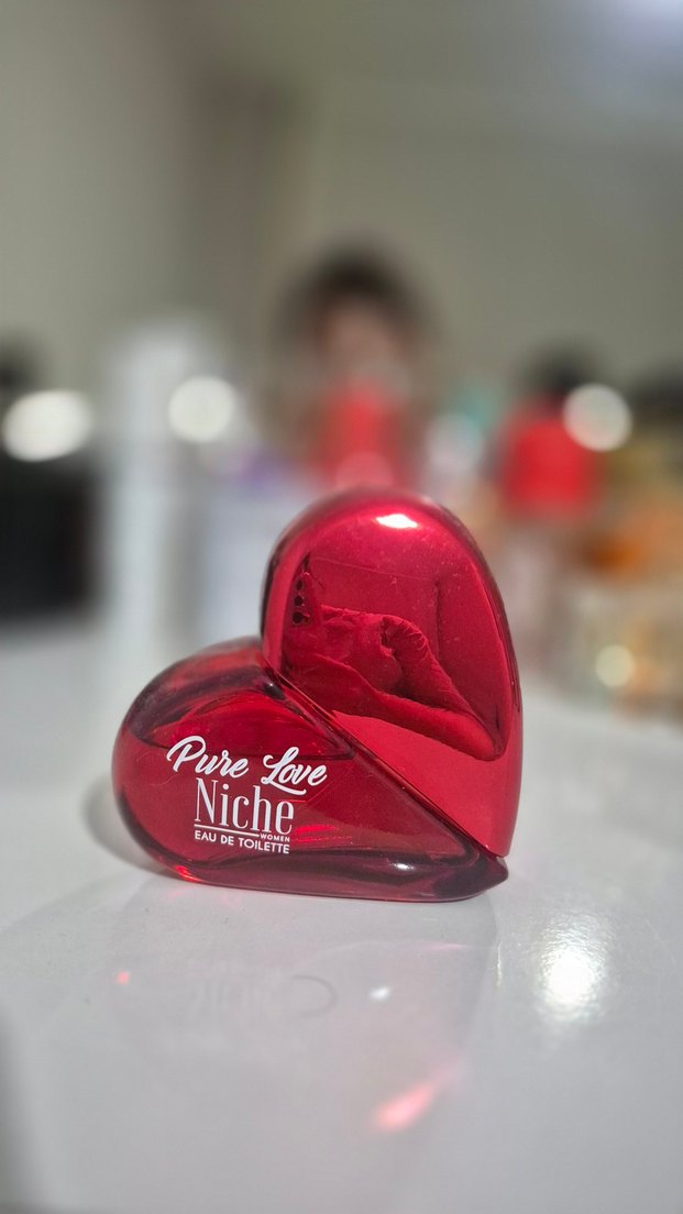 Pure Love Niche, kırmızı kalp şeklinde şişesiyle kadınlar için özel tasarlanmış eau de toilette parfümdür. ❤️
