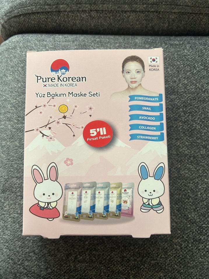 Sınırlı sayıdadır. İlanı direk alabilirisiniz. PureKorean 5 farklı maskeden oluşan yüz bakım seti. Nar, salyangoz, avokado, kolajen ve çilek içerir. Kore üretimi.