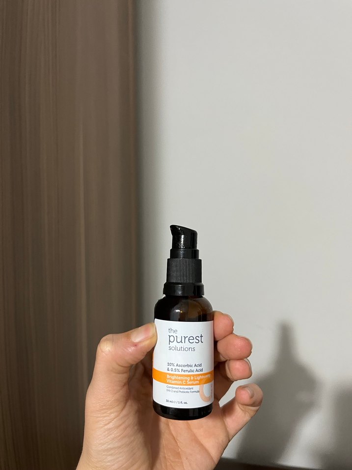 Purest Solutions anti-aging serumu, %10 Askorbik Asit ve %0,3 Ferulik Asit içerir, cildi aydınlatır ve yaşlanma belirtilerini azaltır. Elimle gösterdiğim yerde