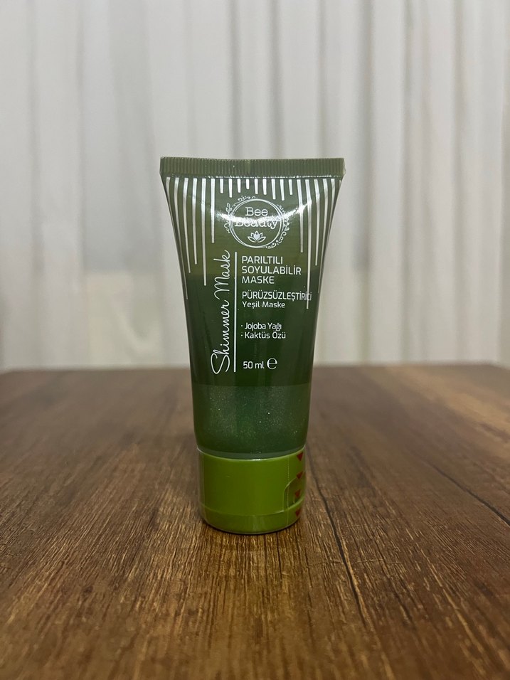 Bee Beauty parıltılı soyulabilir yeşil maske 50 ml. Ambalaj koruma bandı üzerinde. Ürün sıfır. Jojoba yağı ve kaktüs özü içermekte. Pürüzsüzleştici maske olarak da geçmekte. #beebeauty #maske #pürüzsüzleştirici #soyulabilir #jojoba #güzellikmaskesi