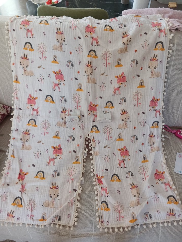 pastel renkli, baskılı puset örtüsü. sevimli hayvan ve gökkuşağı desenleri ile süslenmiş, ponponlu kenarlara sahip. puset yatağını hediye edeceğim.