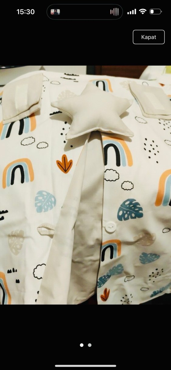 Gri ve çok renkli, sentetik yumuşak kumaştan yapılmış, gökkuşağı ve bulut desenli çocuk uyku aksesuarı. Yıldız şeklinde yastık detayı bulunmaktadır