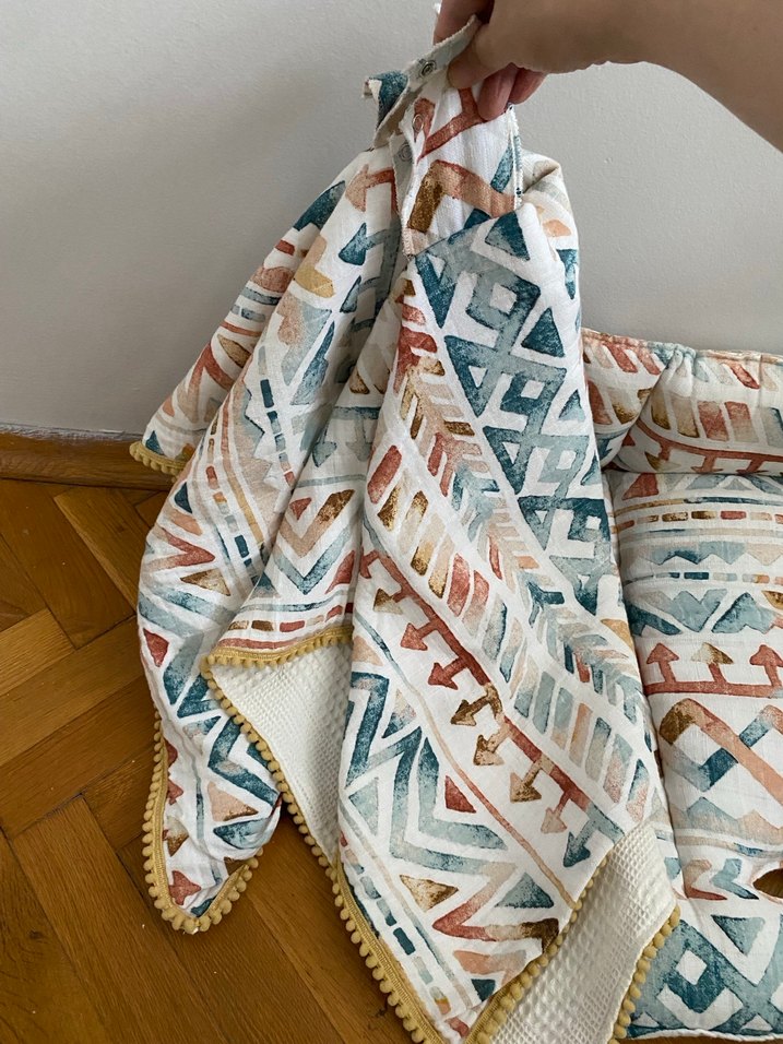 Çocuklar için çok renkli, açık tonlarda batik desenli, tekstil malzemeden yapılmış, kenarı süslemeli battaniye. ️