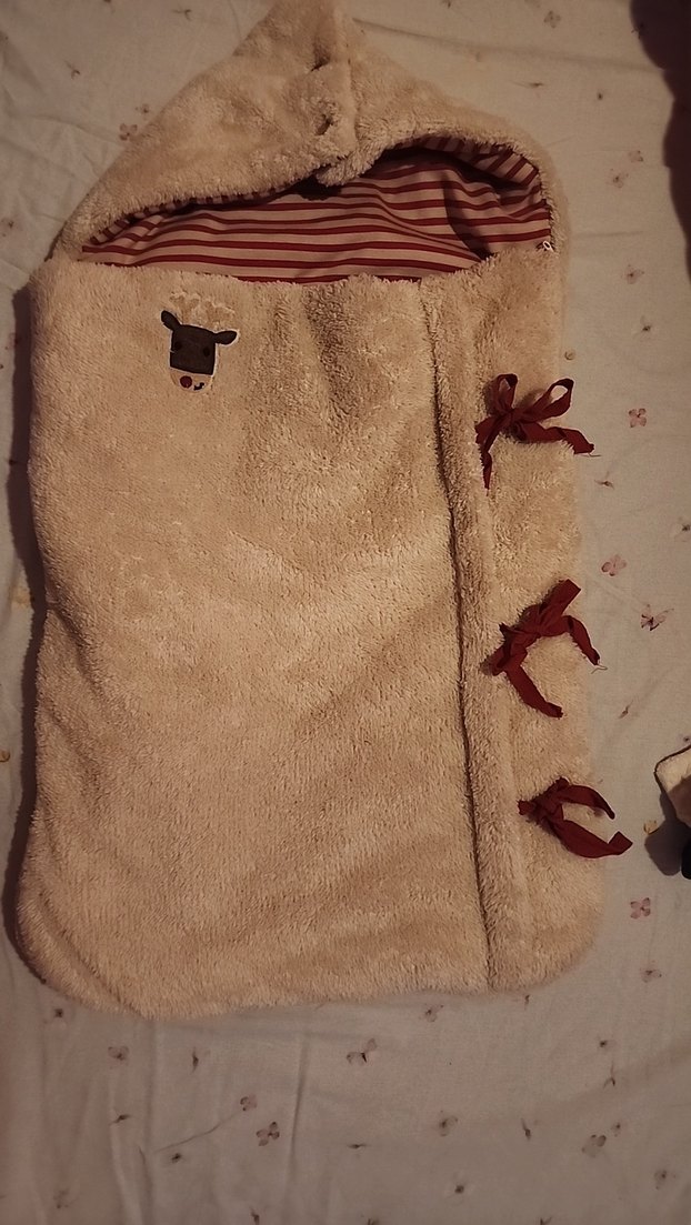 bej ve kırmızı renklerle tasarlanmış, kapüşonlu çocuk battaniyesi, yumuşak ve sıcak kumaştan, yanlarda bağlama detaylarıyla ve küçük hayvan işlemeli desenle. pusette bebekleriniz üşümesin diye cok guzel bir ürün.