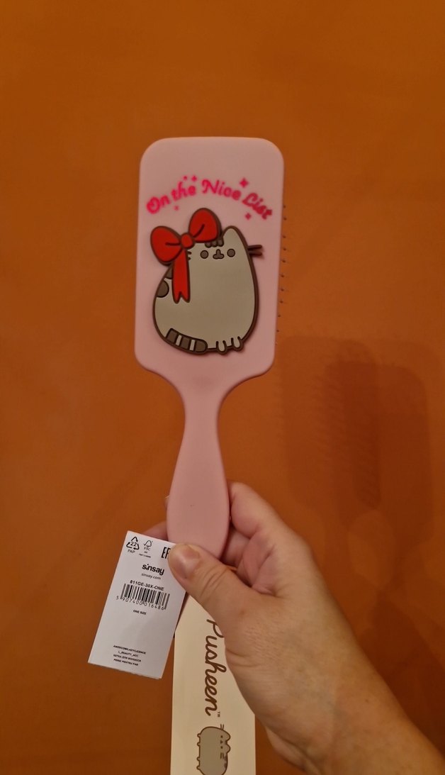 Pushee saç fırçası, pembe sapı ve kırmızı fiyonk detaylı sevimli kedi tasarımıyla saç taramayı eğlenceli kılar.