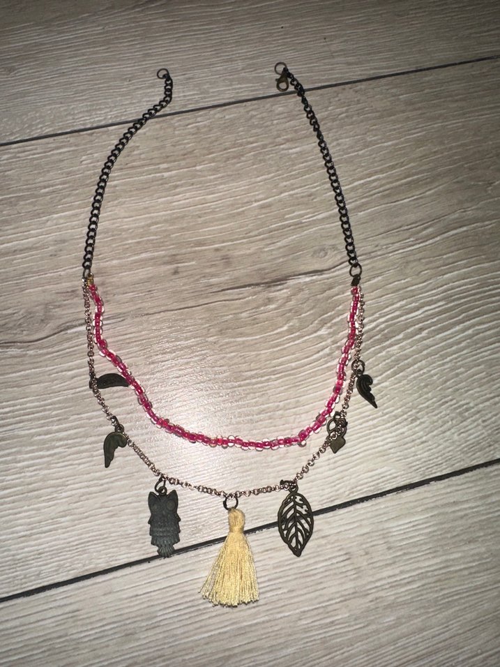 Kısa uzunlukta, zincir detaylı ve pembe nakışlı iplerle süslenmiş bohem tarzı kolye. Baykuş, yaprak ve püskül gibi çeşitli figürler içerir.