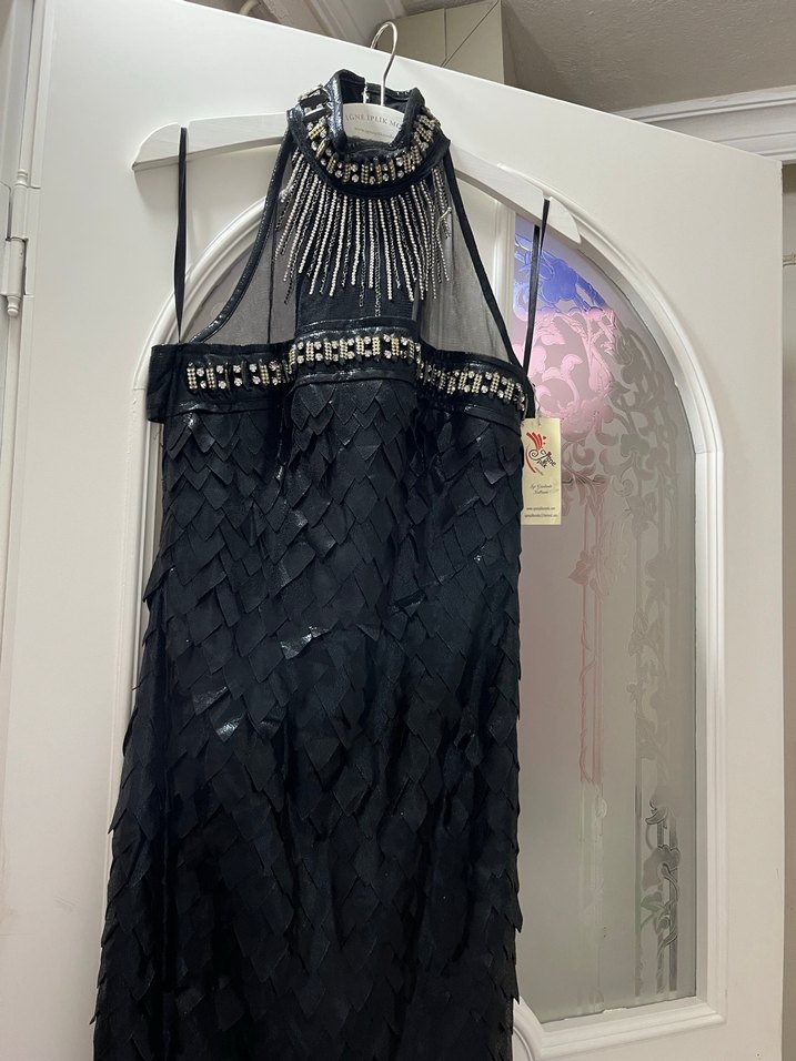 Siyah, uzun ve fitted kesim abiye elbise, halter yaka ve işlemeli püskül detaylarıyla gotik parti stiline uygundur. İnce askılı ve avangart tasarıma sahiptir.