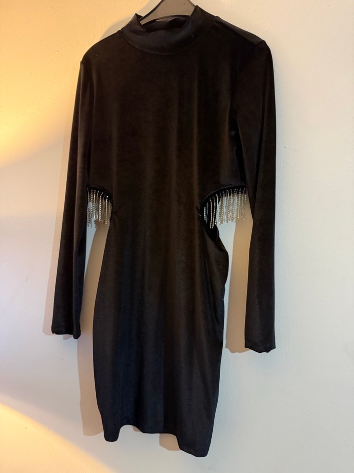 siyah gece elbisesi uzun kollu, yüksek yakalı ve bel kısmında püskül detaylara sahip vücuda oturan defosuz M beden