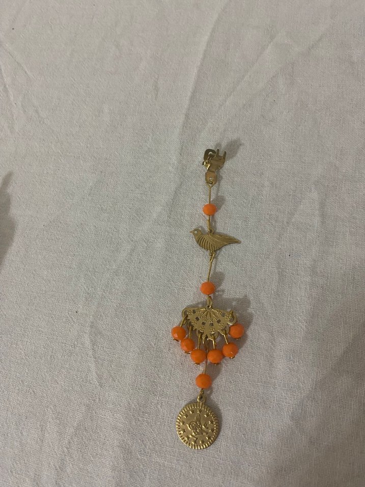 Püsküllü, kuş ve para detaylı, turuncu boncuklu altın renkli bohem kadın charm, düğün için uygun. Saç ve şal için uygun bir tokadır