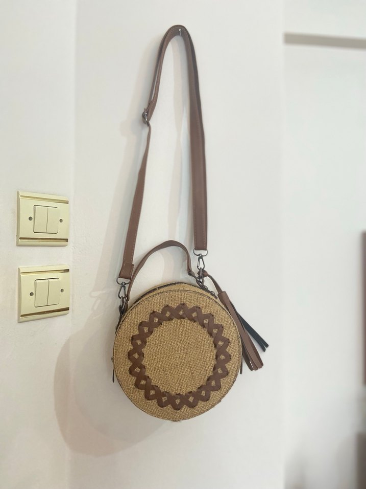 Nakışlı desen ve püsküllü detaylı, örgü kumaştan yapılmış bej yuvarlak çanta. Ayarlanabilir askısı ile kullanışlıdır. Günlük kullanım için bohem tarzda.