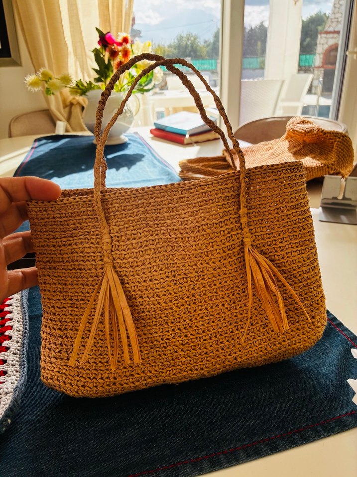 Püsküllü, bej renkte, yumuşak dokulu örgü kadın çanta. Bohem tarzda, günlük kullanıma uygun pastel tonlarda.
