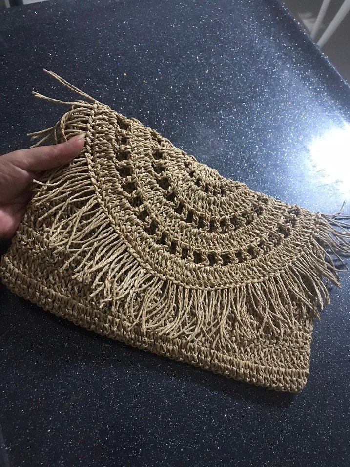 Bej renkli, işlemeli detaylara ve püsküllere sahip örgü clutch çanta. Bohem tarzıyla günlük kullanıma uygundur.