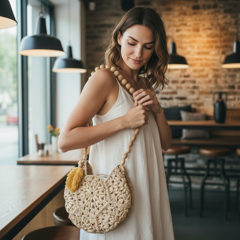 Bej renkli hasır örgü çanta, işlemeli desen ve püskül detayına sahiptir. Ahşap boncuklu askısı ile bohem tarzını yansıtır. Günlük kullanım için uygundur.