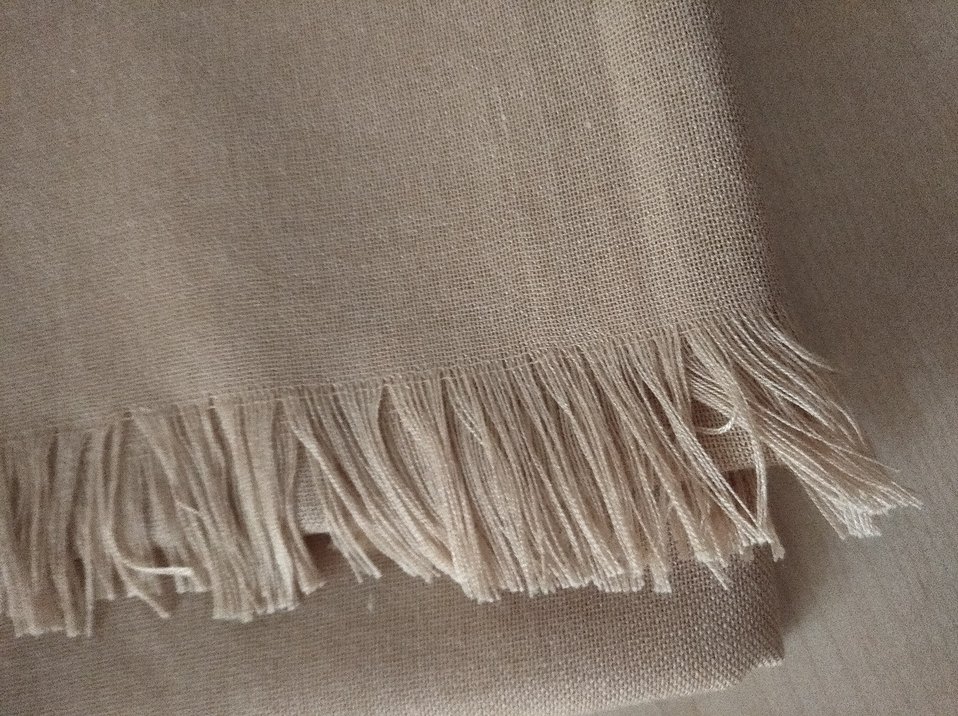 Püsküllü bej keten kadın şal, Yumuşak ve nefes alabilir kumaş konfor sağlar.