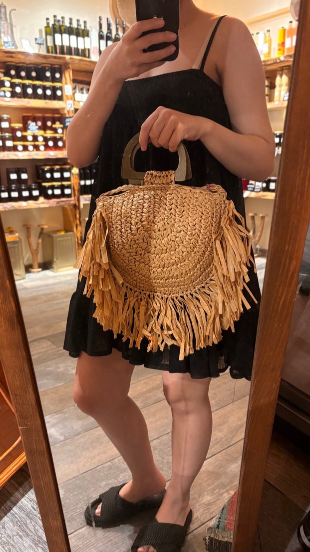 Ahşap saplı, işlemeli detaylı bej örgü çanta. Günlük kullanıma uygun, bohem tarzda püsküllü.