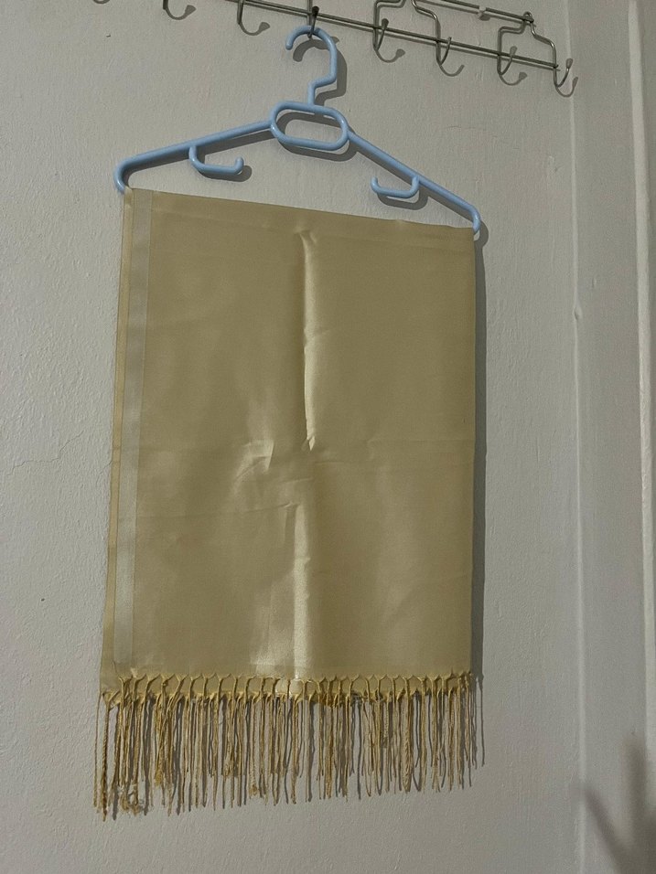 Kadınlar için saten, parlak bej renkte, püskül detaylı bohem tarzda şal. Minimalist ve retro esintiler taşıyor. ✨