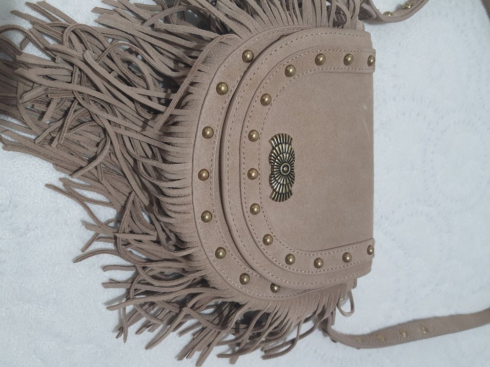 Nakışlı detaylar ve püsküllerle bezenmiş bej süet çanta, bohem tarzıyla günlük kullanıma uygun uzun askılı. Arka tarafında etiketi yapistigi için iz vardır.