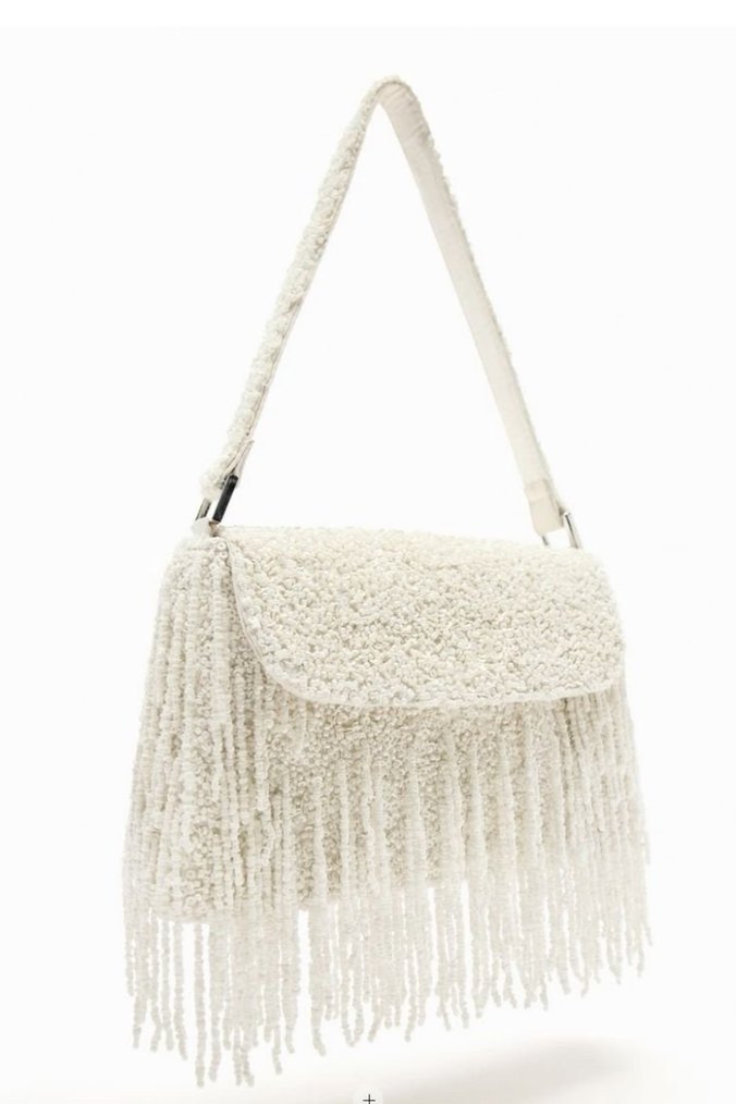 Beyaz bohem tarzda, nakışlı ve püsküllü kadın çantası, yumuşak sentetik kumaştan, düğünler için uygun.