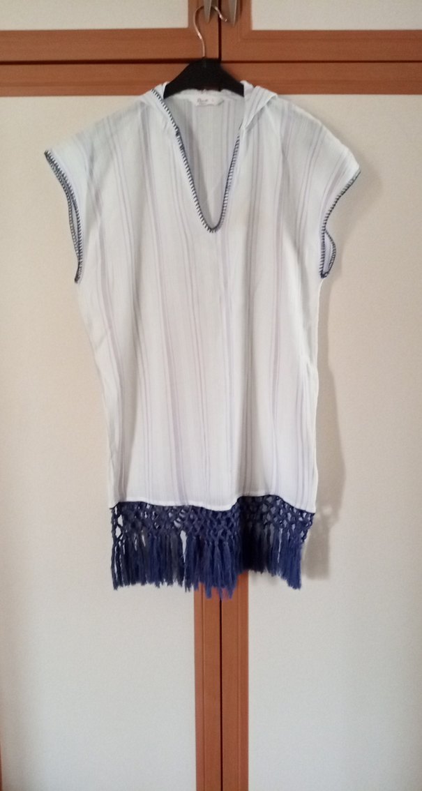 Püsküllü beyaz bohem tarzda, V yaka ve kolsuz midi pareo Gri batik desenli, bol kesim rahat kullanıma uygun.