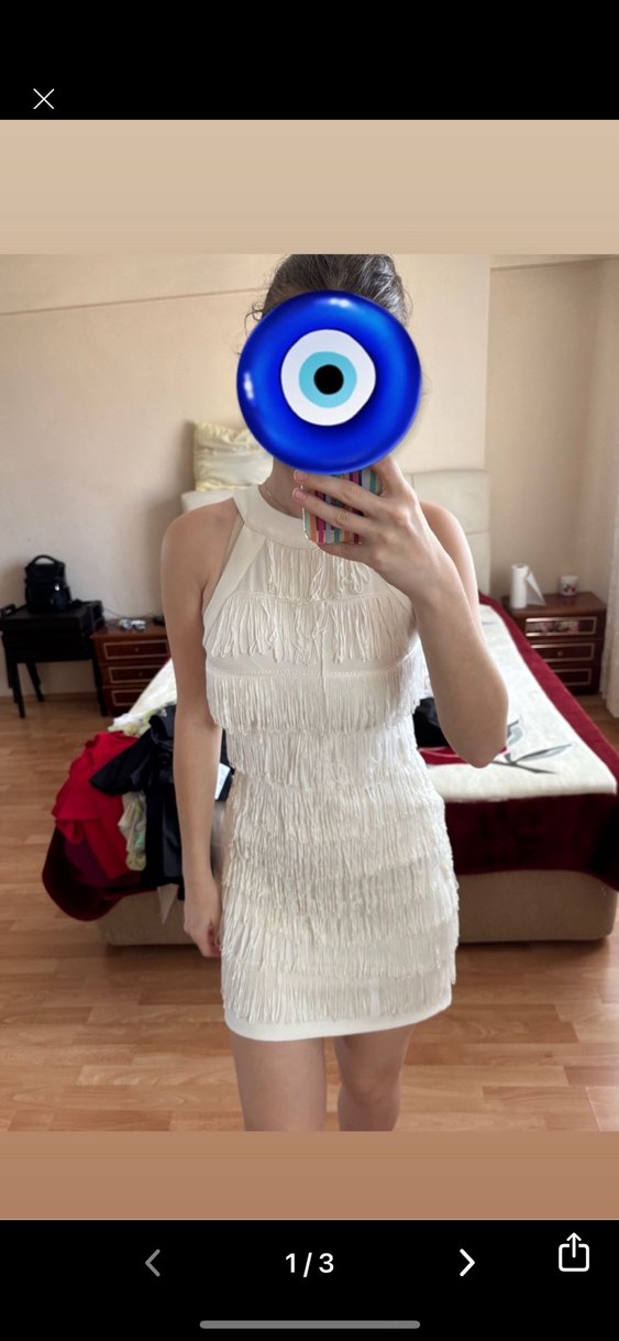 Halter yakalı, püsküllü detaylara sahip beyaz mini elbise, sentetik kumaştan üretilmiştir. Bohem tarzı ve hafif baskılı deseniyle parti için uygundur.