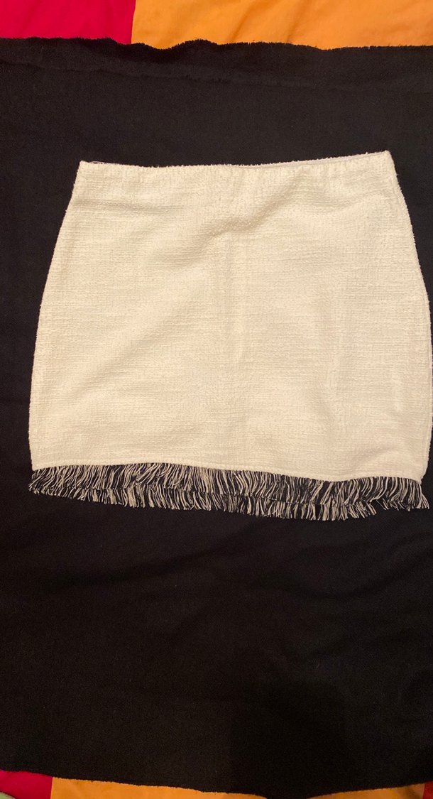 Yumuşak sentetik kumaştan yapılmış, püskül detaylı beyaz, vücuda oturan mini etek. Düz, bohem tarzda günlük kullanıma uygun.