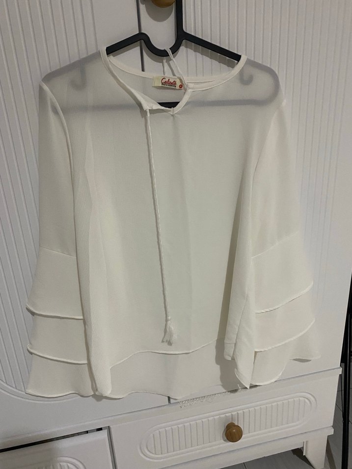 Beyaz renkte, pamuklu kumaştan yapılmış, uzun kollu ve bol kesim bluz. Kısa boylu, yuvarlak yakalı ve püskül detaylı, bohem tarzda günlük kullanıma uygun.
