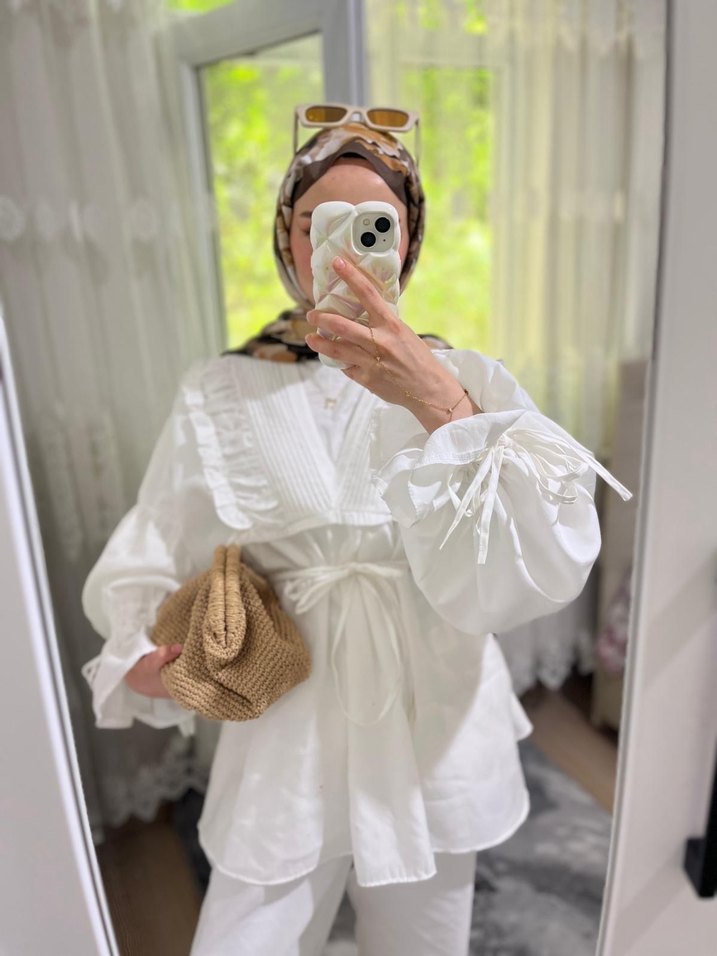 Uzun kollu, püsküllü detaylı, beyaz pamuk salaş yazlık takım