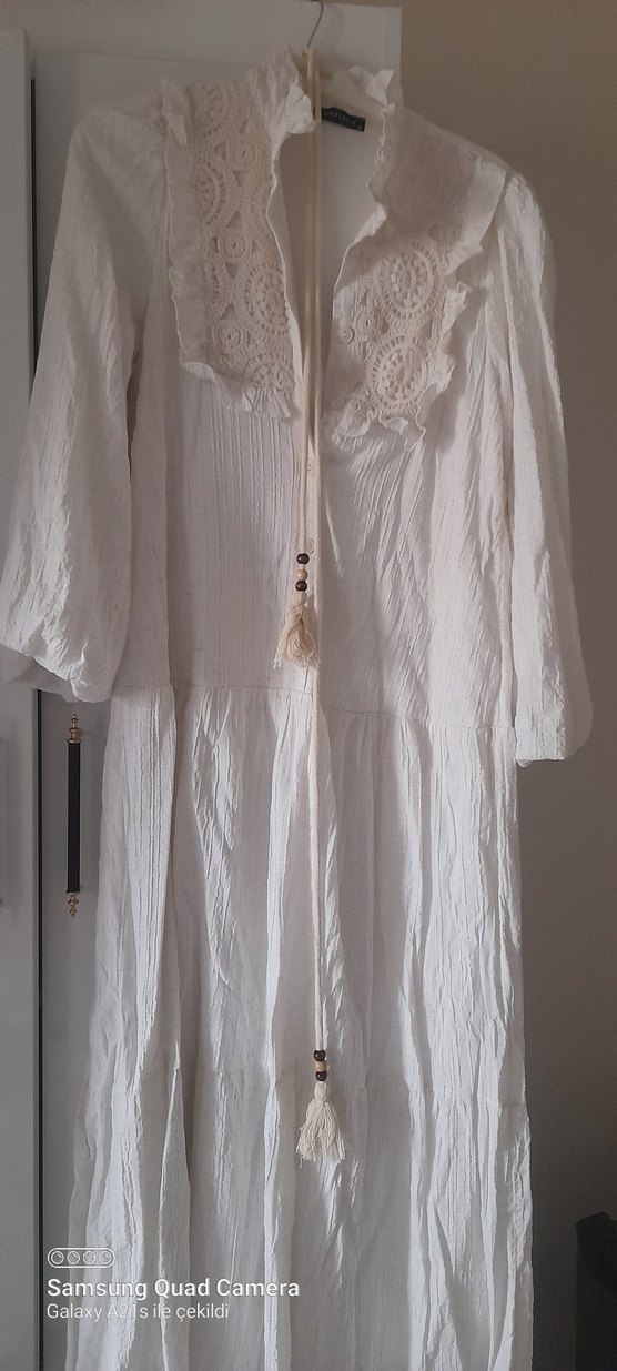 Beyaz uzun keten elbise, bol kesim, yakalı, işlemeli detaylar, püsküller ve askılı kollara sahip, günlük kullanım için uygun.