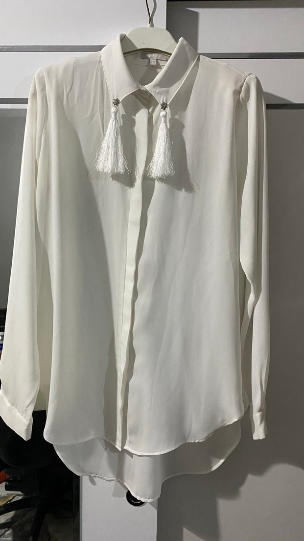 Beyaz renk, uzun kollu, yakalı ve püskül detaylı kadın gömlek. Rahat kesimli ve ipeksi dokulu, ofis için bohem tarzda uygun.