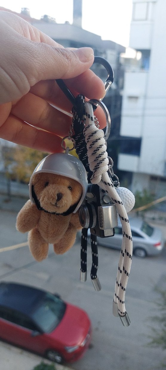 anahtarlık, kasklı sevimli camel renkli ayıcık, püskül ve küçük kamera figürüyle biker tarzı ve rock punk havası sunar. Fotoğraf makinesi flash özelliği var.sari küçük valiz kartlık için kullanılabilir.