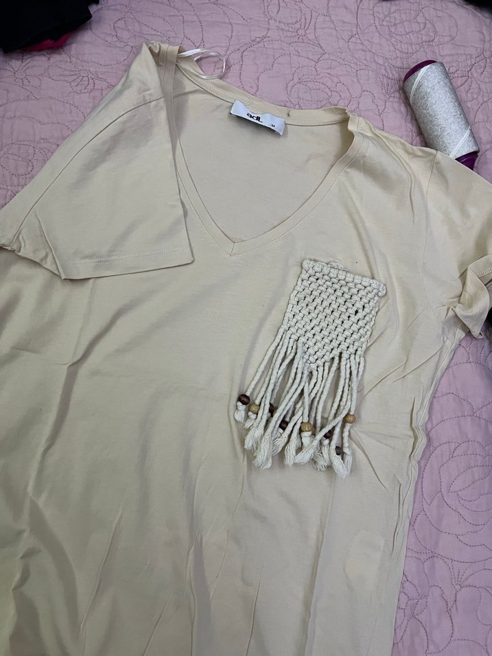 Bohem tarzı, kısa kollu, V yaka, gevşek kesim beyaz kadın tişörtü. Önünde püskül detaylı örgü cep bulunur. Rahat ve günlük kullanım için uygundur.