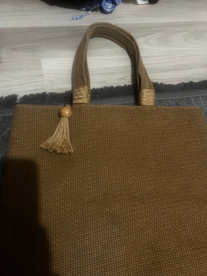 Sentetik kumaştan yapılmış, püsküllü ve işlemeli desenli bej bohem tarzı kadın çantası. Günlük kullanıma uygundur.