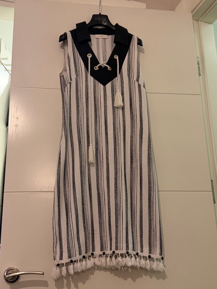 Bej ve gri çizgili, yakalı ve püsküllü detaylara sahip kolsuz uzun elbise. Rahat kalıplı, yumuşak sentetik kumaştan üretilmiştir.