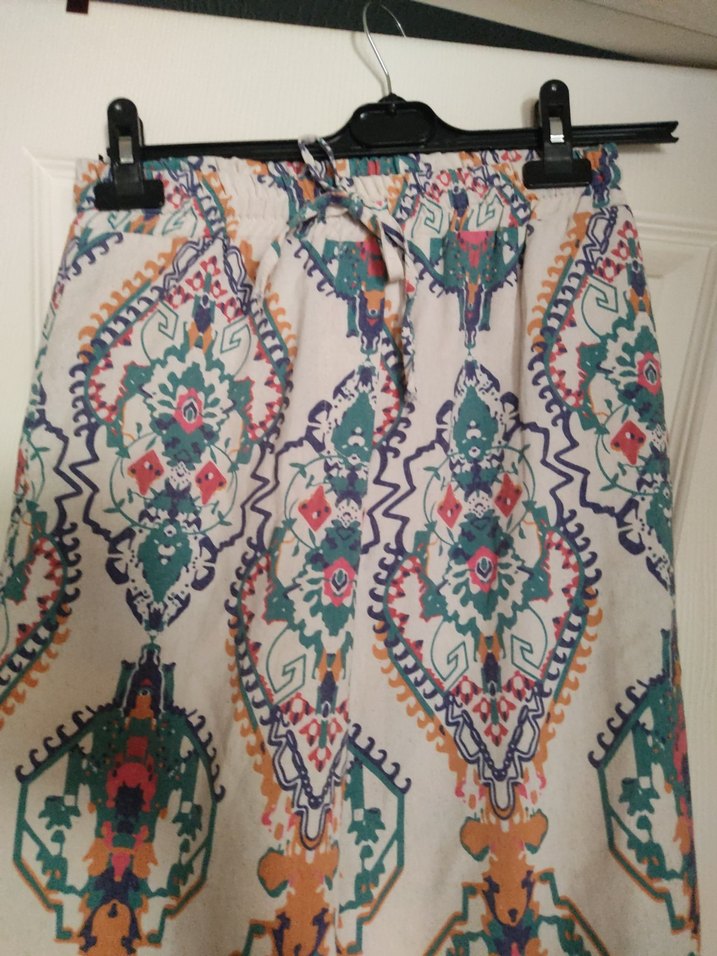 Püsküllü detaylara sahip, çok renkli batik desenli, bol kesim uzun kumaş pantolon. Günlük kullanıma uygun bohem tarzda.