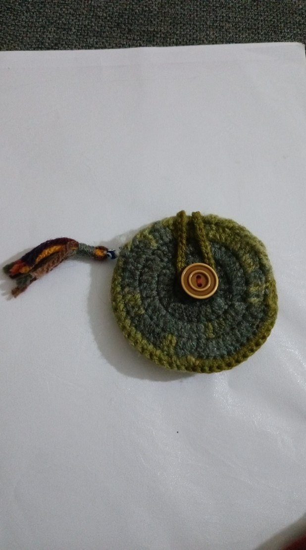 Püsküllü ve düğme detaylı, haki ve gri yuvarlak tasarımlı bohem tarzı kadın cüzdan, günlük kullanım için uygundur.