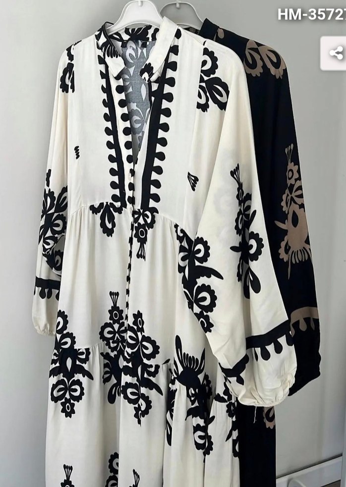 siyah uzun elbise, bol kesim, uzun kollu ve V yaka. Bohem desenli, püskül detaylı, yumuşak sentetik kumaştan. Günlük kullanıma uygun.