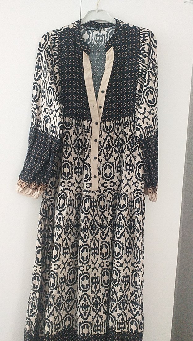 uzun kollu, V yakalı, bol kesim bohem desenli uzun elbisedir. Çok desenli tekstil kumaştan yapılmıştır, günlük kullanıma uygundur.