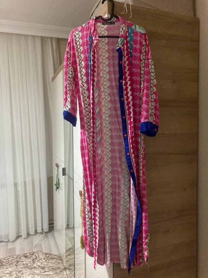 Renkli, bol kesim bohem uzun elbise, uzun kollu ve yakası çentikli. Canlı batik desenli, püsküllü ve yumuşak dokulu kumaştan yapılmıştır.