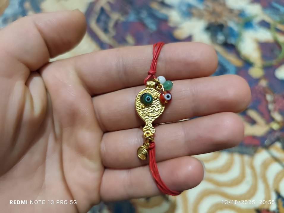 Kırmızı ip üzerinde renkli boncuklar ve püsküllü, altın dokulu bohem etnik bileklik, günlük kullanıma uygun.