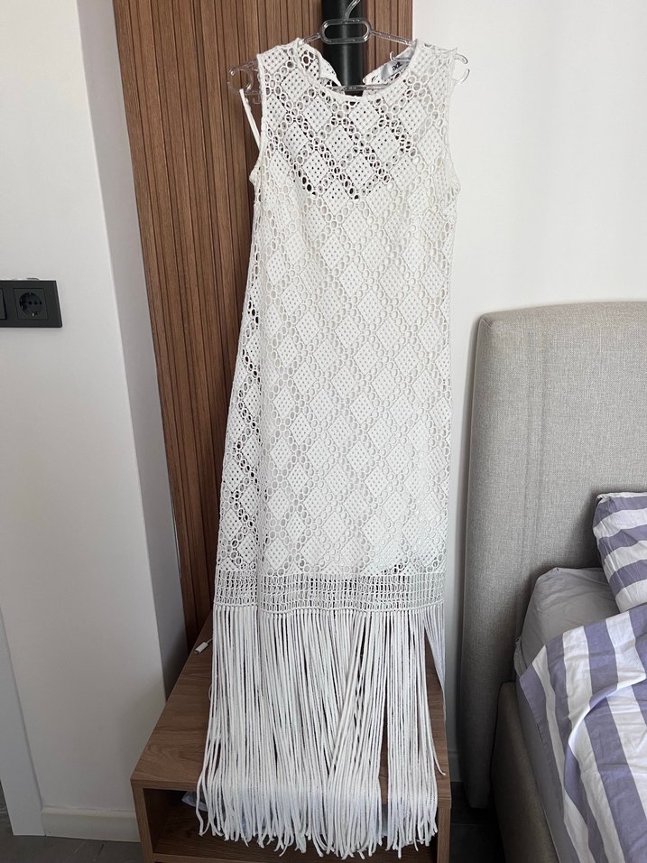 Püsküllü, nakış detaylı, beyaz güpür kumaştan kolsuz uzun elbise. V yaka ve regular kesim, bohem tarz için uygundur.