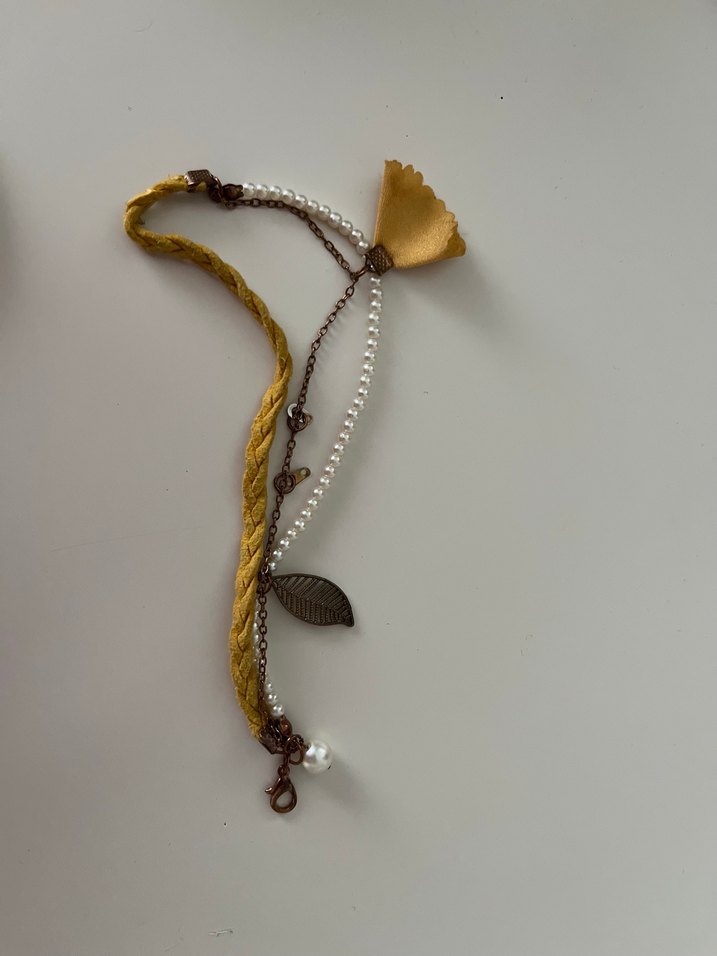 Nakış detaylı, püsküllü ve inci görünümlü boncuklu altın tonlu bohem kadın el zinciri.