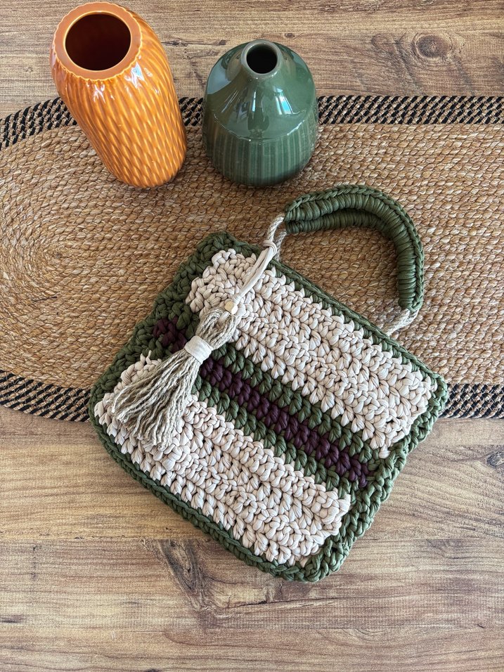 Bohem tarzda, örgü kumaştan kadın çantası. Nakış desenler ve püskül detaylarıyla khaki ve gri tonlarını birleştirir. Günlük kullanıma uygun, rahat ve retro görünümlü.