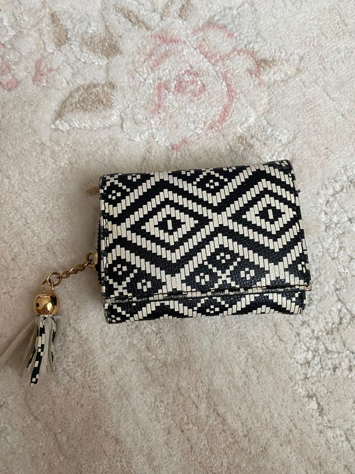 Kadınlar için siyah beyaz geometrik desenli, püsküllü bohem tarzda sentetik kumaştan portföy çanta.