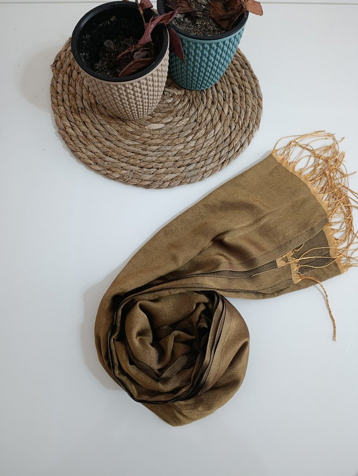 Püsküllü kahverengi saten dokulu kadın şal, bohem, hippie ve retro tarzlara uyum sağlar. Yumuşak ve rahat bir görünüme sahiptir. ÇİFT TARAFLI KULLANİLABİLİR