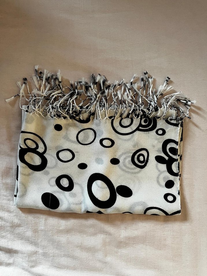Yumuşak dokulu beyaz ve siyah bohem tarzı kadın şalı, siyah dairesel desenler ve püskül detaylarıyla rahat bir görünüm sunar.