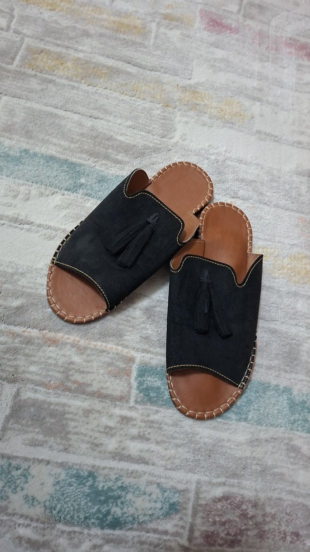 Yumuşak süet malzemeden yapılmış, püsküllü ve kama topuklu kadın terlikleri. Kahverengi ve gri batik desene sahip, günlük kullanıma uygun bohem tarz.
